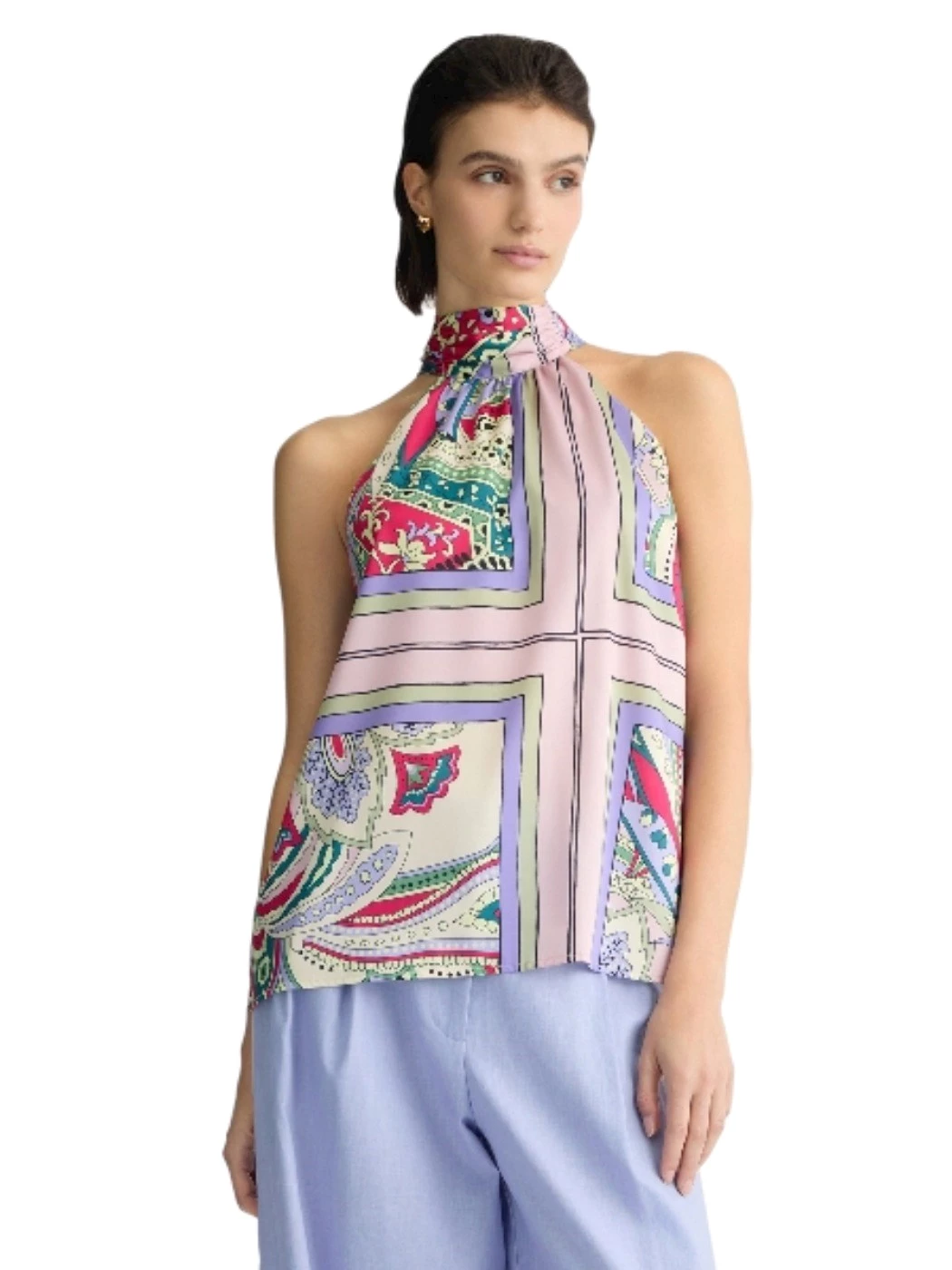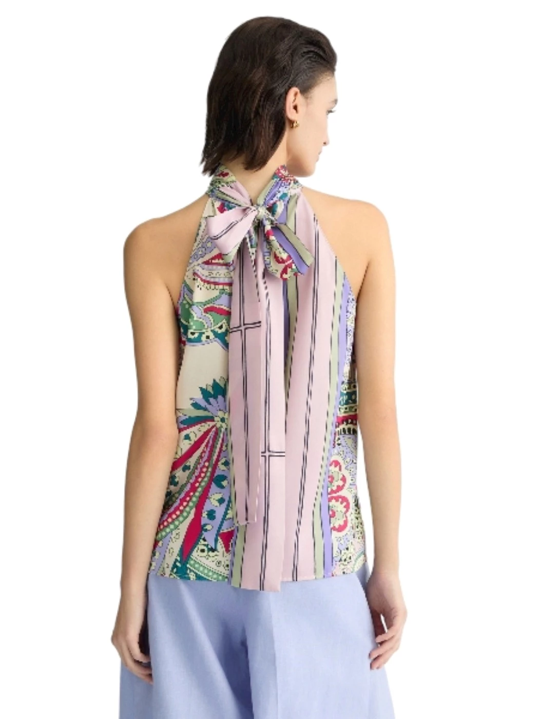 cod. WA5394T5973 FANTASIA Top multicolor Realizzato in raso Stampa foulard all over Scollo all'americana Fiocco sul retro